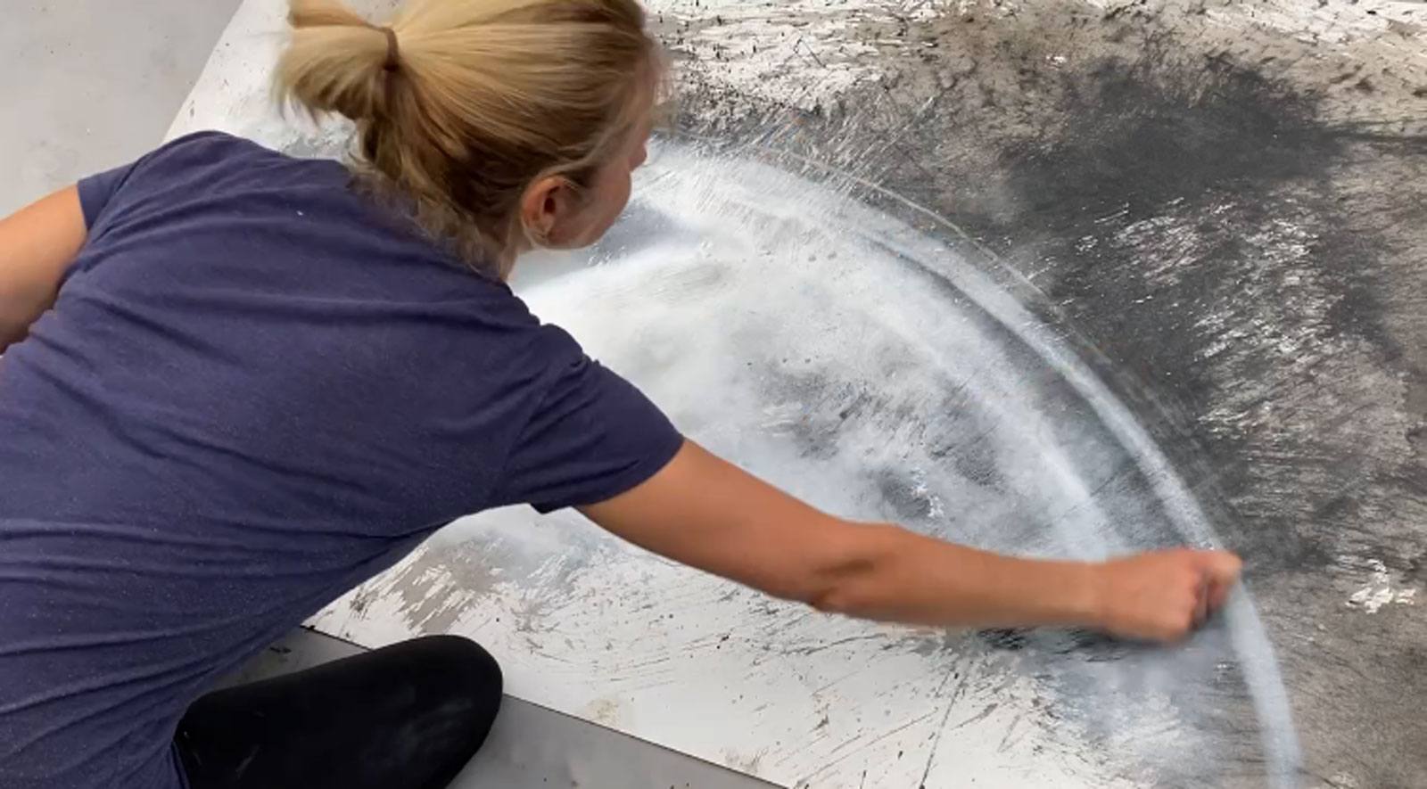 Natasha uses her drawing as a form of calming touch therapy, using expressive charcoals (made at home), a key colour pastel, salt, sand, seawater, spray paints, sound graphs and just her hands as the tools, all creating a personal and embodied nature to the piece. She uses rolls of paper because they simulate a journey, where the past is rolled away, like memories, and the future is the blank path ahead of us.