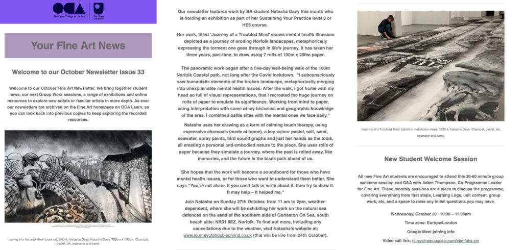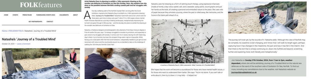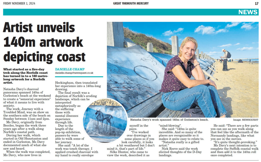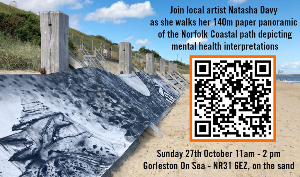 Join local artist, Natasha Davy, as she exhibits her 140m panoramic drawing parallels between Norfolk’s eroding coastal path and her struggles with anxiety.